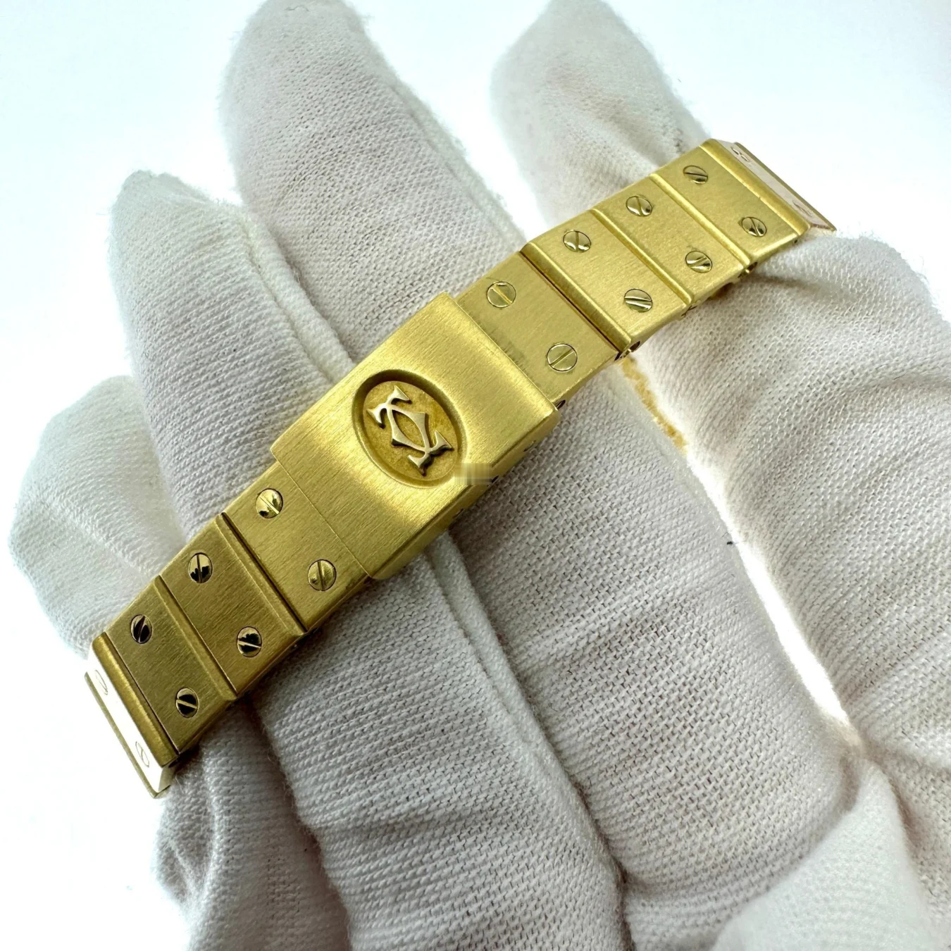 The integrated 18K yellow gold bracelet is secured with a fold clasp. The watch fits a 6.375 inch wrist.