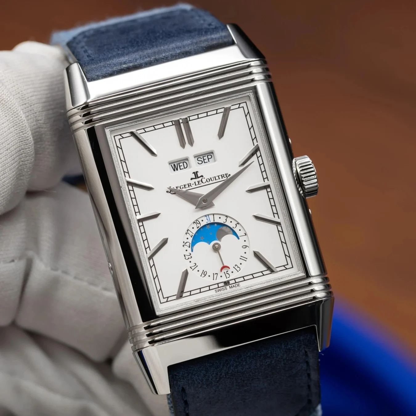 One of the most iconic reversible watches in horology, the Reverso Duoface offers two distinct dials—perfect for travel, dual time zones, or simply switching up your look. This stainless steel version has a clean silver front dial with guilloché detailing and a striking blue dial on the reverse.
