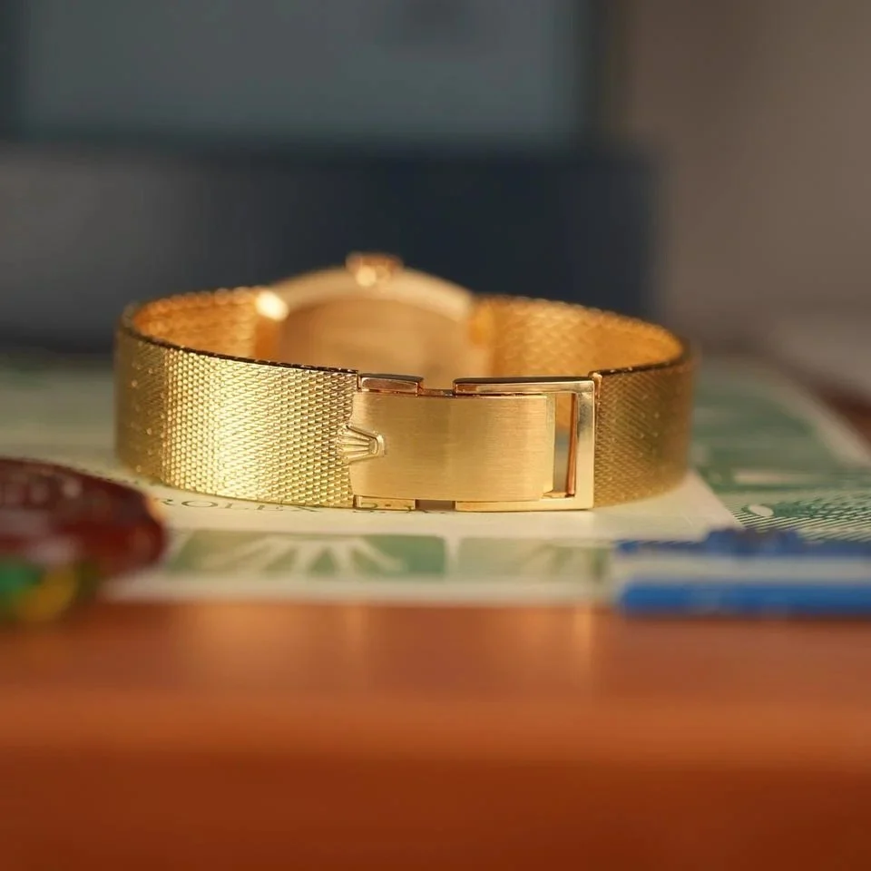 This is an exceptional ladies’ Rolex Cellini Orchid reference 3466 from 1986, crafted entirely in 18k yellow gold and adorned with original Rolex factory-set diamonds around the bezel. The watch is new old stock, a true safe queen that has never been worn, making it one of the rarest and most pristine examples of its kind. Its elegant and unique case design is paired with a gold dial featuring a diamond-cut pattern that continues seamlessly into the bracelet. At 20 mm wide (21 mm including the crown) and 25 mm in length, it sits perfectly on the wrist, combining refinement and presence.