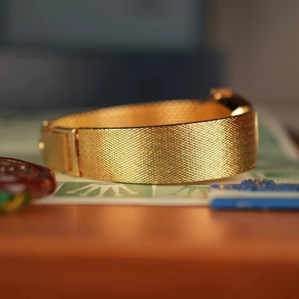 The 18k gold case shines as it did the day it left the factory, with factory diamonds sparkling around the bezel. The gold dial is flawless, carrying the same intricate pattern that is echoed in the matching bracelet texture. This integrated gold bracelet is original and fits up to approximately 6.25 inches. Because the watch is new old stock, there is virtually no wear on the bracelet, clasp, or case. a condition that is almost impossible to find today.