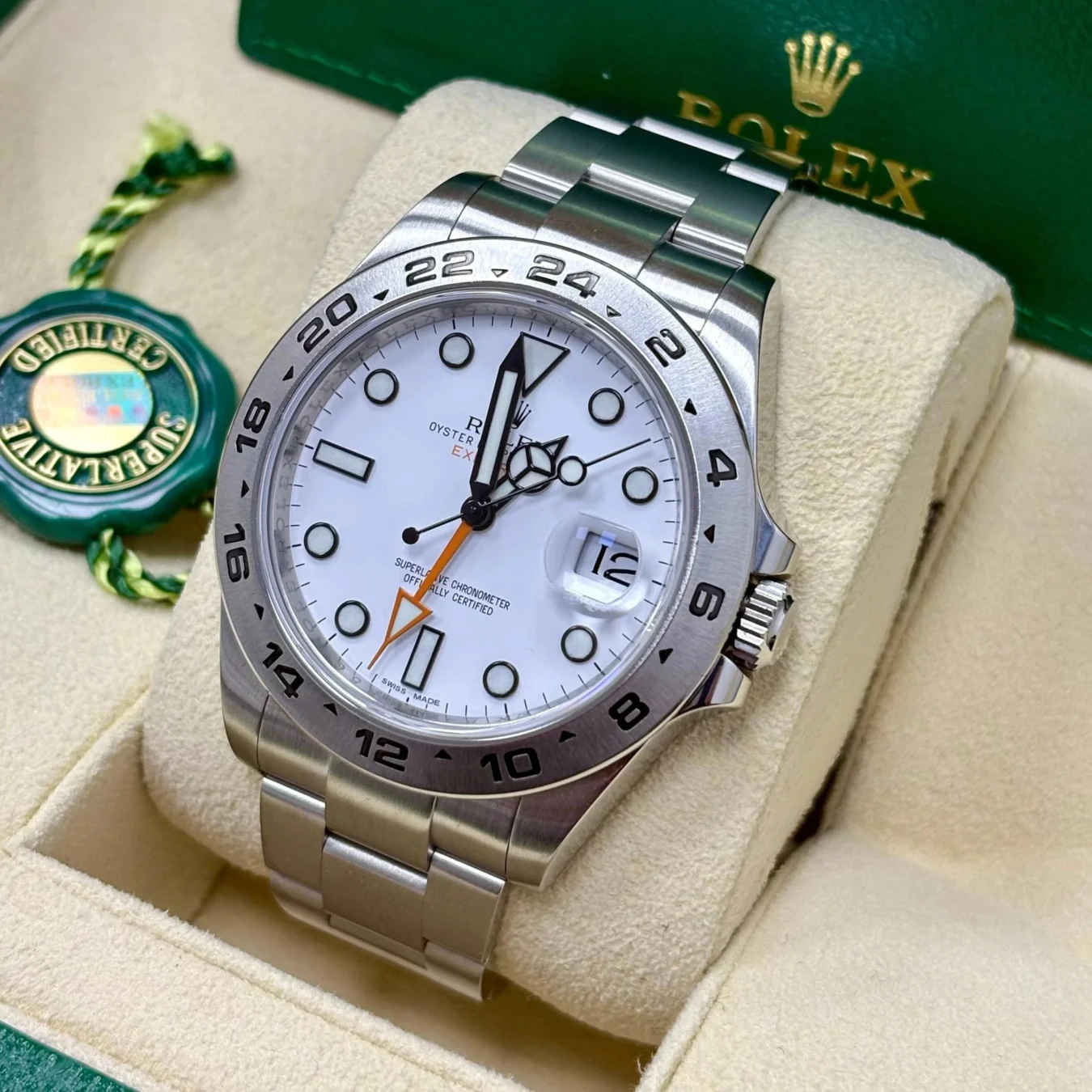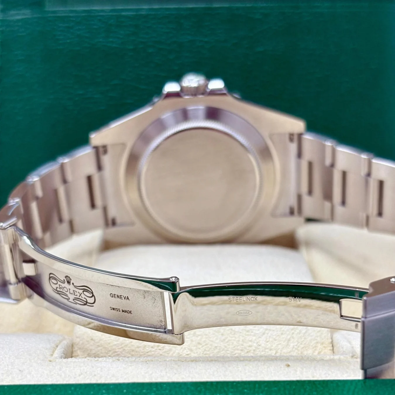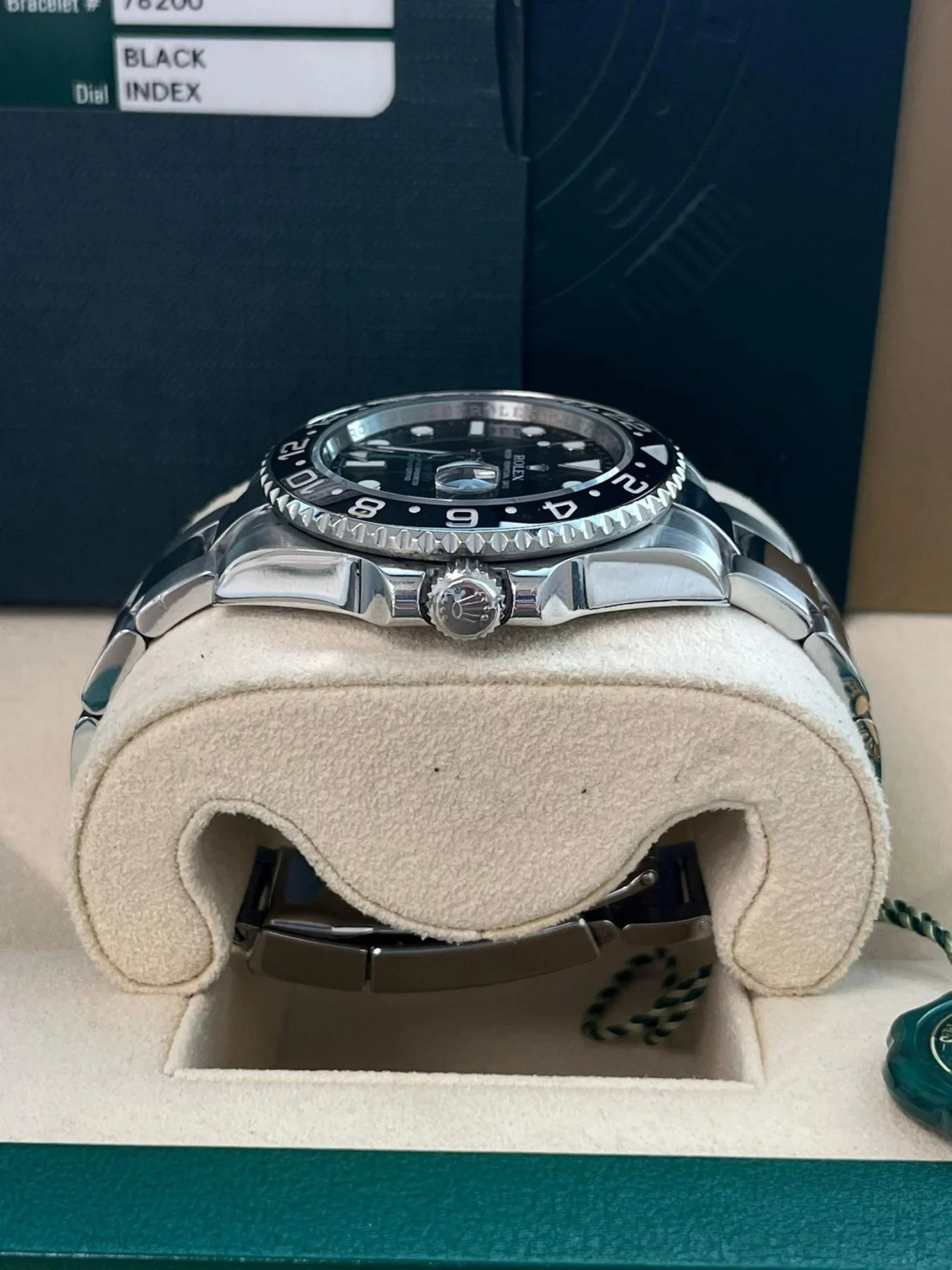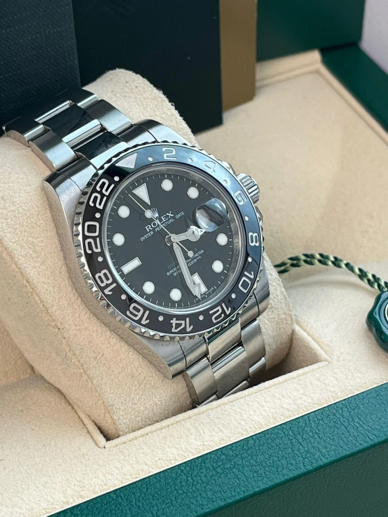Rolex logo on the crown. Stainless steel bidirectional rotating 24-hour bezel with black Cerachrom ceramic insert. Scratch-resistant sapphire crystal with Cyclops magnifier. Black dial with white luminescent hour markers and Mercedes hands. Green GMT hand. Date window at 3 o’clock aperture. Stainless steel oyster bracelet with flip-lock clasp.