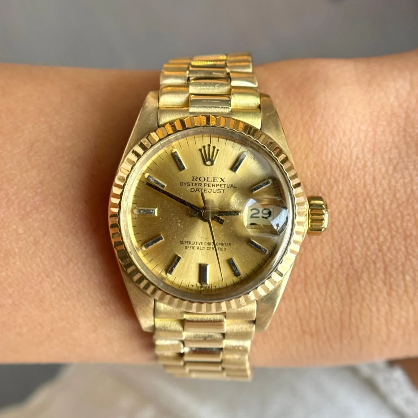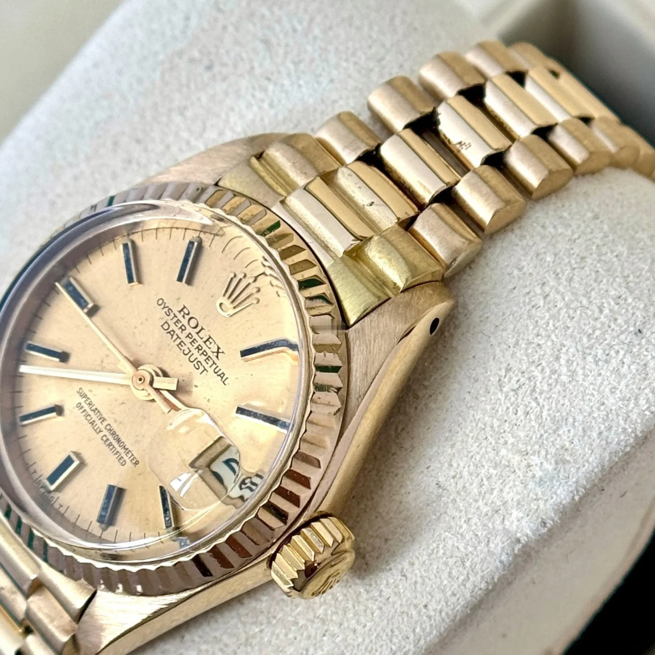 A classic and iconic Rolex Lady-Datejust 26 mm President in solid 18K yellow gold, featuring a champagne dial. This watch is on a Presidential 18K gold band with hidden crown clasp. Reference number 6917, produced in 1981. This watch is all original.