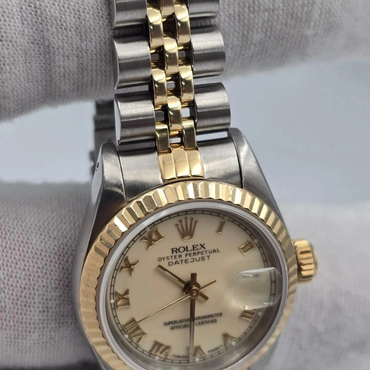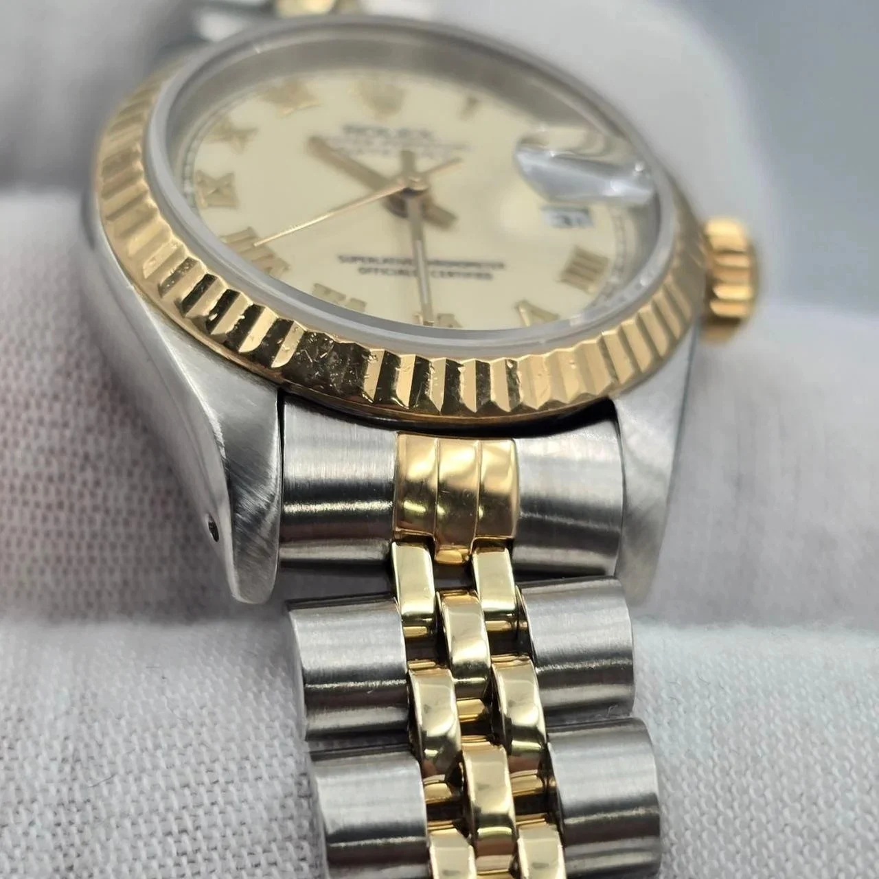 Authentic Rolex Watch Rolex Datejust Fluted Bezel Two Tone Jubilee Cream Roman Dial 26mm Watch Reference: 69173 Condition: Pre-owned Watch that works well and is in Excellent condition Fits a wrist up to 7.25″ R Serial – Watch was manufactured in 1987-1988 Includes: Watch and Papers dated 1990 Please look at all pictures for details as this is the actual watch you are buying. All watches over $5000 will be shipped insured to the closest FedEx location for you to show ID and sign for insurance purposes.